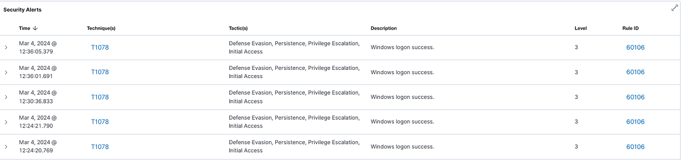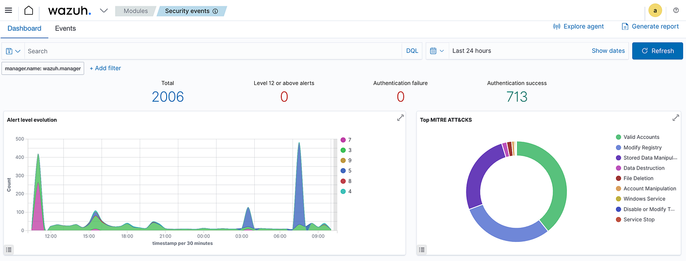 The Security Events module above, is showing the top half of the dashboard. If you’re familiar with the ELK stack, it will look familiar as Wazuh uses ELK under the hood. There’s the familiar query search field and time frame dropdown. The first two graphs detail alert levels and MITRE ATT&CK rules.